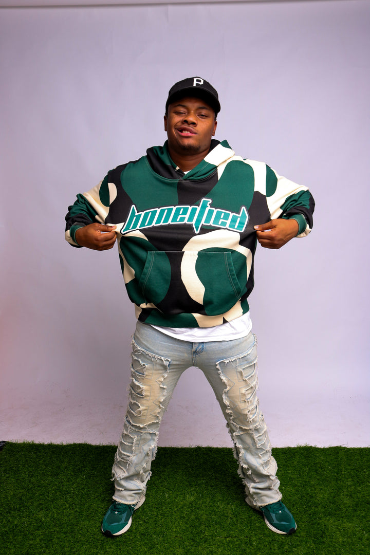 Premium 405 GSM heavyweight hoodie with an all-over custom camo design in green, cream, and black. Oversized Bonefied logo stamped across the chest for a bold streetwear look. Built from durable heavyweight cotton for long-lasting quality, with a slightly oversized fit for comfort and style.